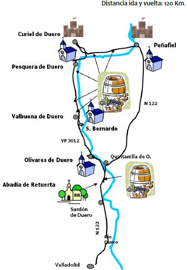 Discurre esta ruta por la zona vallisoletana de la ribera del Duero para, como dice el título, disfrutar de dos culturas, la del vino y la arquitectura histórica.
