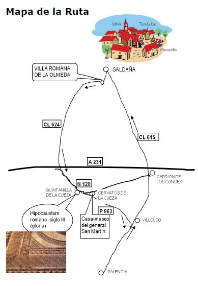 De regreso te recomiendo tomar la CL 624 y N 120 hasta Quinta-nilla de la Cueza, posee otra villa romana (Pago de Tejada) con una curiosa “gloria” y dando un paseo (2 Km.) en Cervatos de la Cueza podemos ver la Casa Museo del general San Martín, donde se recuerdan las raíces castellanas del libertador de Argentina.
